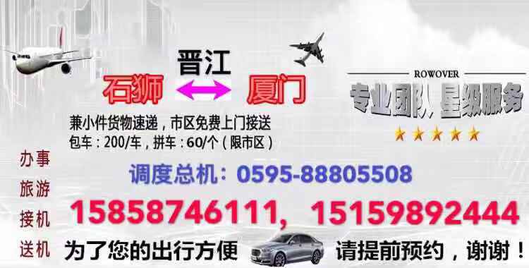石狮晋江到厦门拼车包车私家车专线调度,厦门到石狮晋江泉州私家车拼车包车往返专线,拼车60,包车200,乡镇另议,天天发车,车辆干净整洁,上门接送,高速直达。 联系我时,请说是在季晨网看到的,谢谢!
